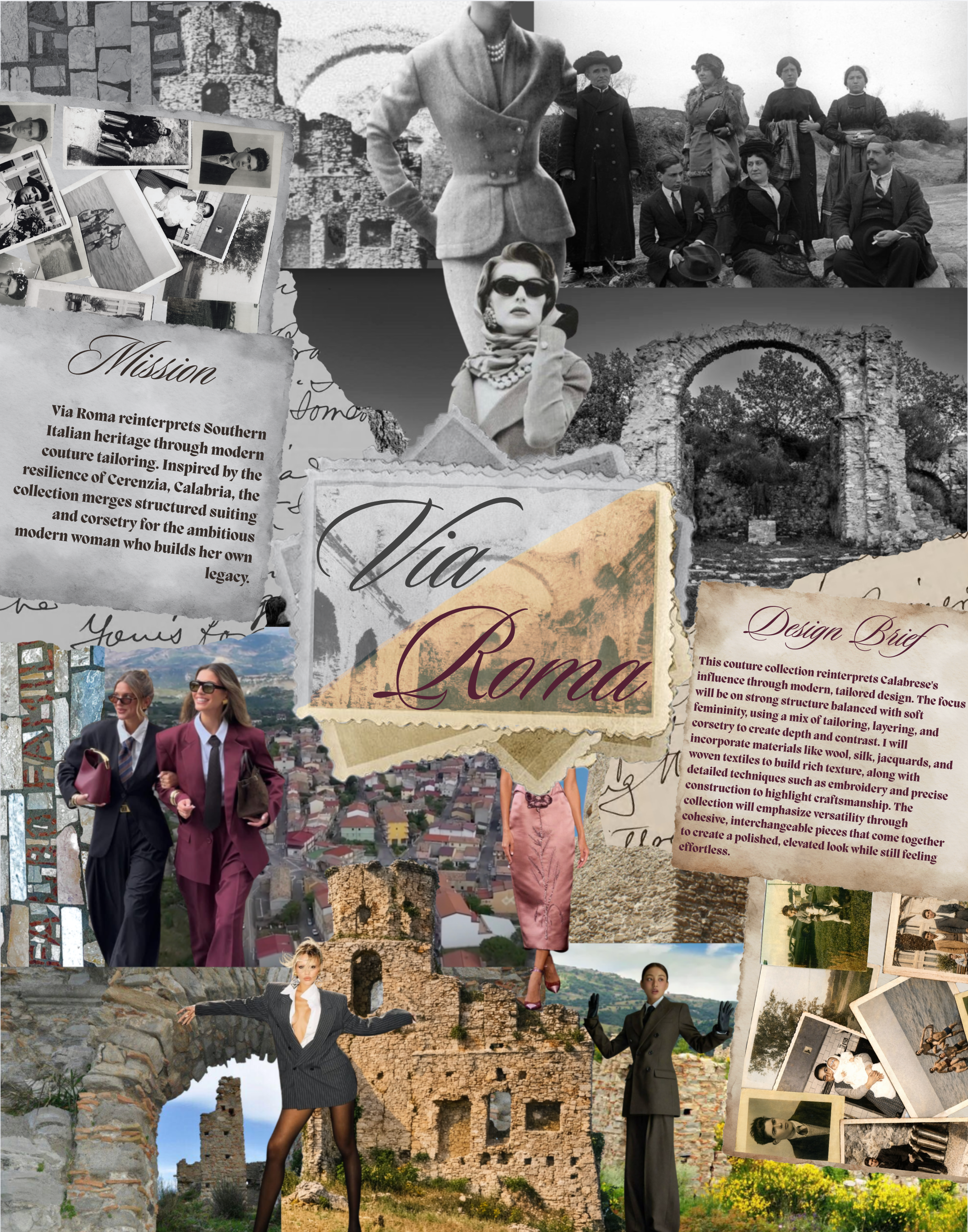 My capstone collection titled “Via Roma” is inspired by my family’s lineage in Calabria, Italy. Where my ancestors lived through poverty, migration, and rebuilding. Using old family photos as inspiration, my collection will draw from traditional tailoring and textile work, reflecting both labor and craftsmanship. Through structured suiting, corsetry, and layered textures, I reinterpret these elements for a modern woman who is ambitious, polished, and building her own legacy.